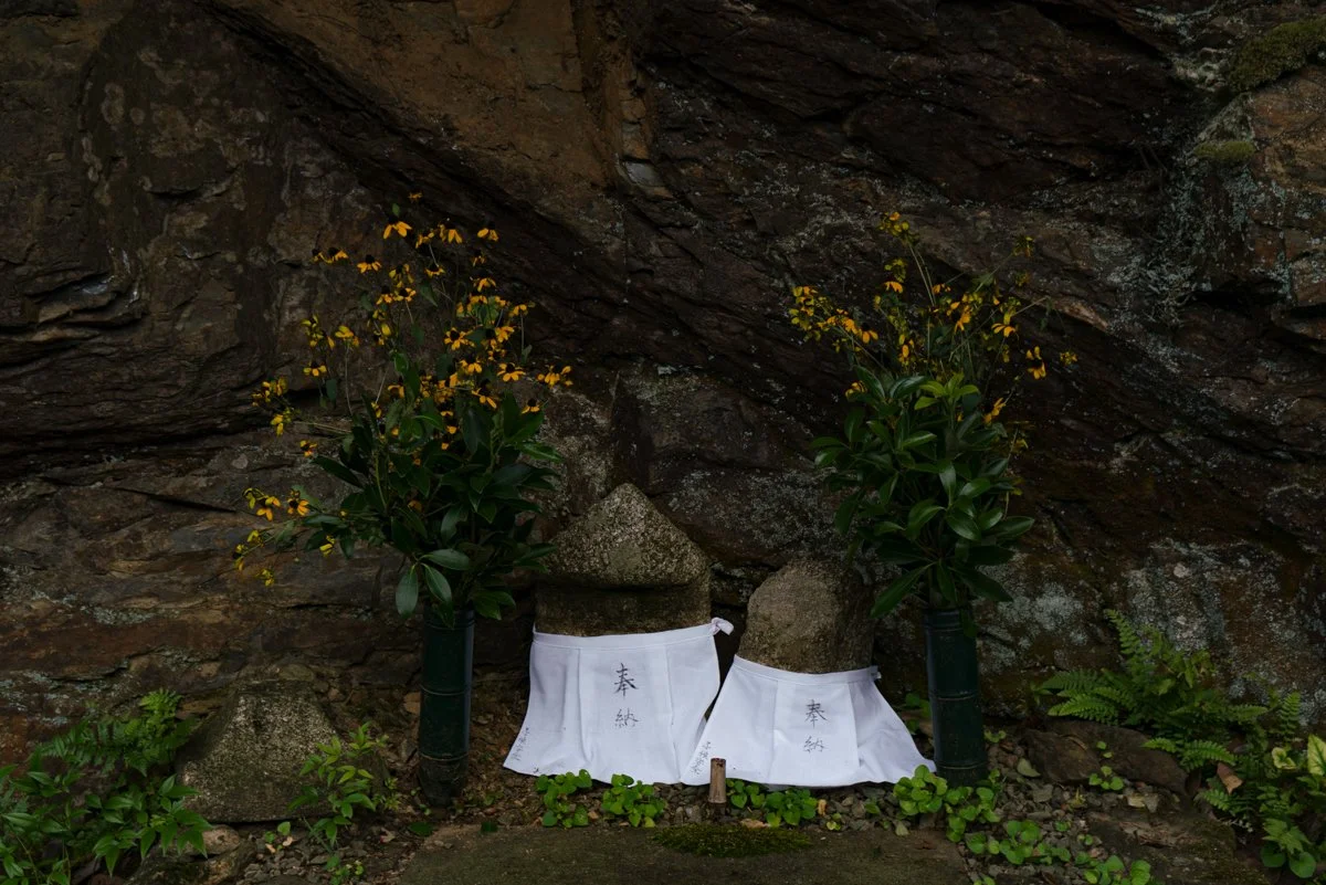 Stone statute of slender Kannon (female bodhisattva) overgrown with moss. Loved for its fragile beauty and modesty, moss is cherished in Japan as a symbol of resilience and stead-fastness. Because it does not develop roots, it also exemplifies ability to live without attachments –a virtue that Buddhism elevates as a path to enlightenment. Ideally suited to Japan’s humid climate and thriving in the most uninviting environments, moss can often be found in dark forests, gardens, cemeteries, covering trees, rocks and stones.